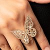 Dainty white emerald cut rhinestones are sprinkled across the golden wings of a butterfly that is encrusted in glassy white rhinestones for a dramatically dazzling finish. Features a stretchy band for a flexible fit.