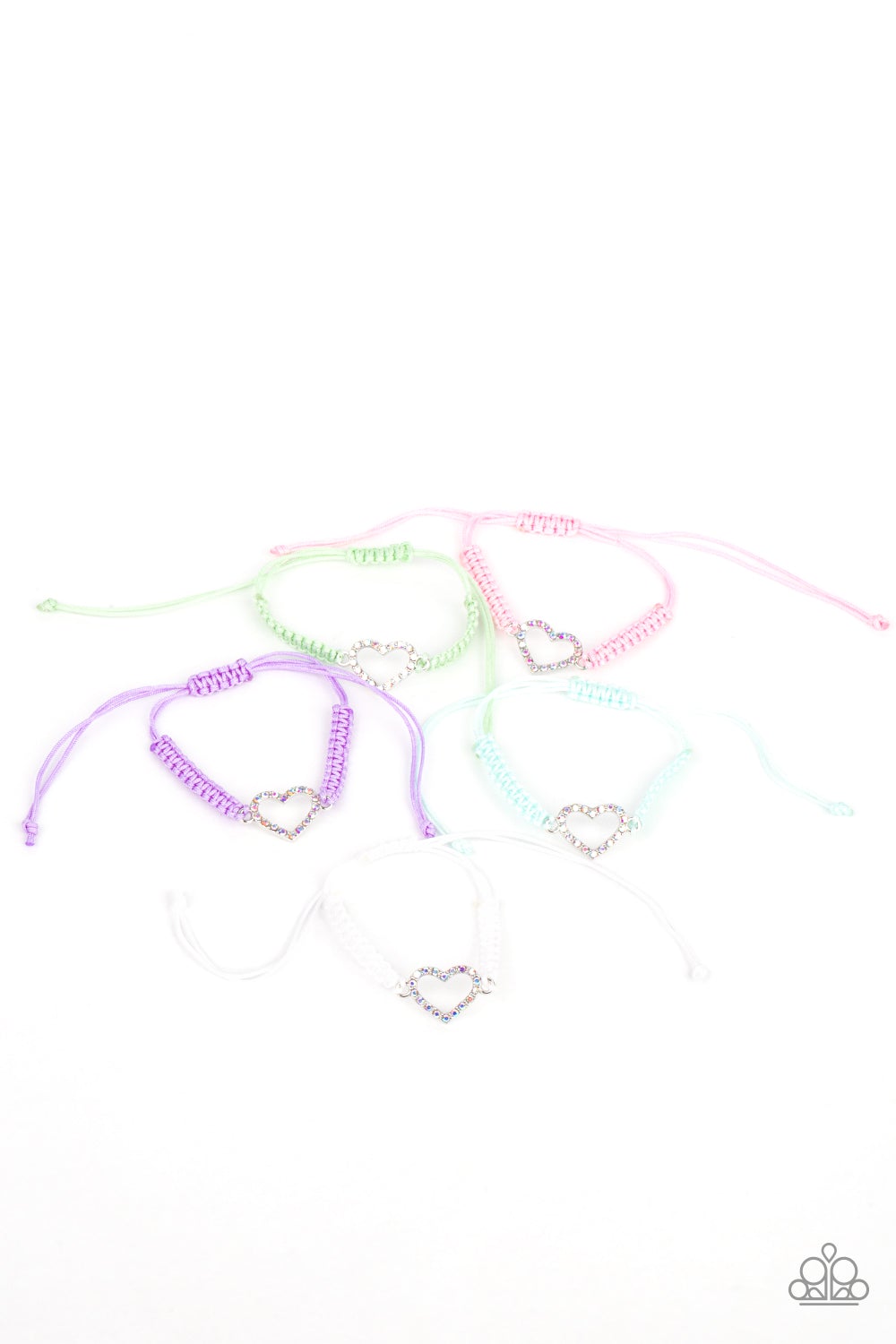 Infused with iridescent rhinestone encrusted heart frames, the colorfully layered bracelets vary in shades of pink, green, purple, blue, and white. Bracelets feature adjustable sliding knot closures.